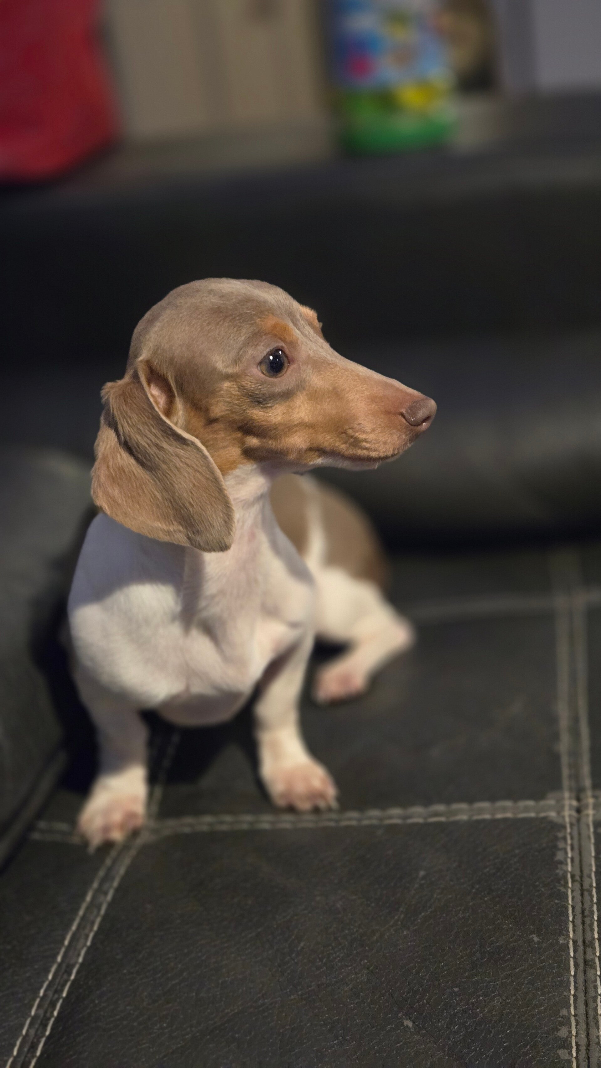 Coconut is a smooth coat, CKC registered miniature dachshund. She is an isabella and cream piebald. Coconut is expected to mature around 9 - 10 lbs. Coconut does not carry the long haired gene so all of her puppies will be smooth coat.